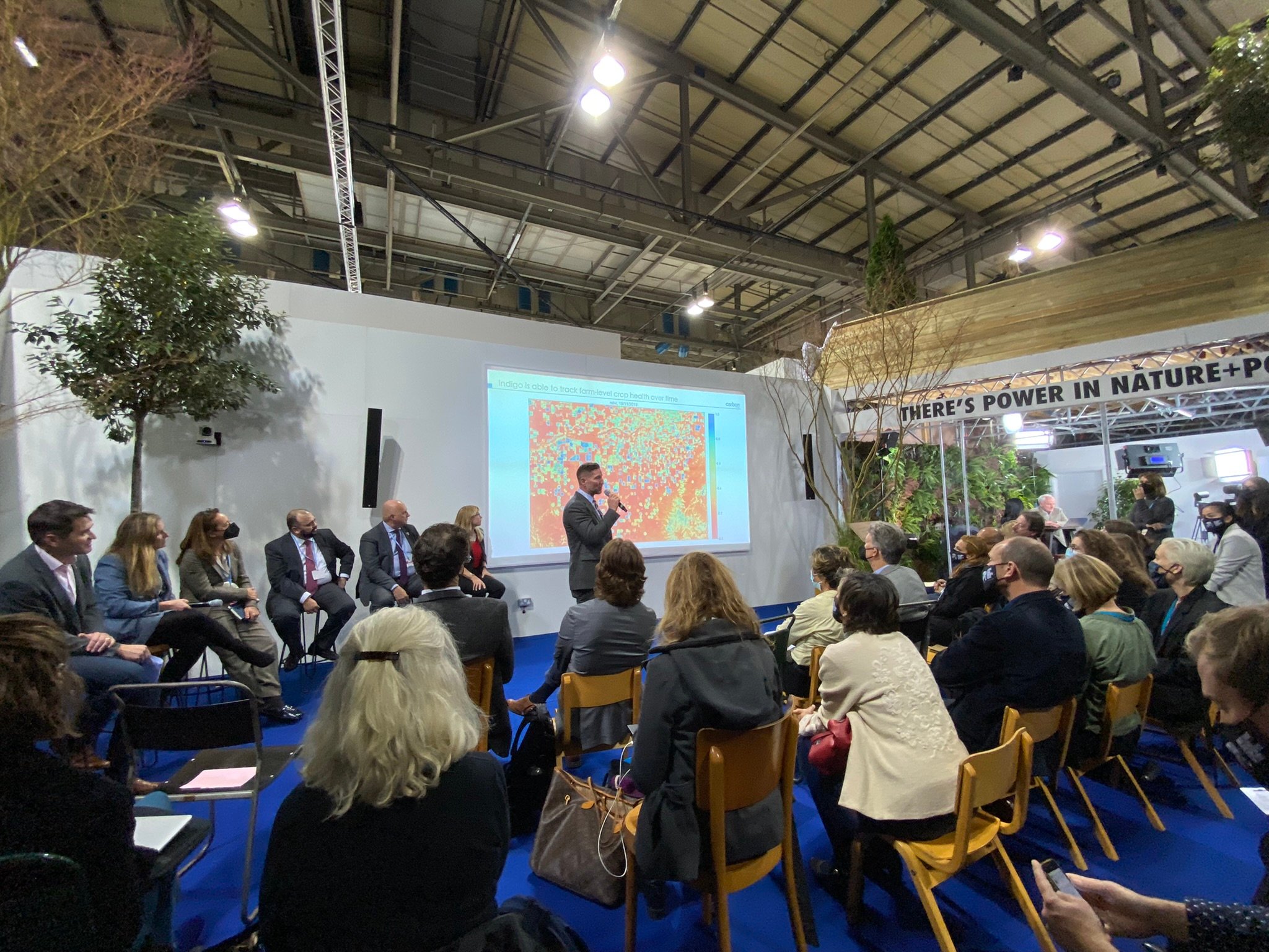 Week 1 saw the launch of the voluntary market-focused Business Alliance for Scaling Natural Climate Solutions (BASCS) and an overall focus on defining a high bar for quality for credits, and increased transparency into project impact. One good example of this is the efforts of the World Economic Forum and the Natural Climate Solutions Alliance to highlight particularly high-quality efforts through their UpLink Challenge and support for Lighthouse projects. As part of their panel on “Financing Nature-Based Solutions,” Indigo was able to share with the COP audience an example of our satellite monitoring technology and some of the ways we can verify adoption of beneficial practices such as reduced tillage and cover crops.